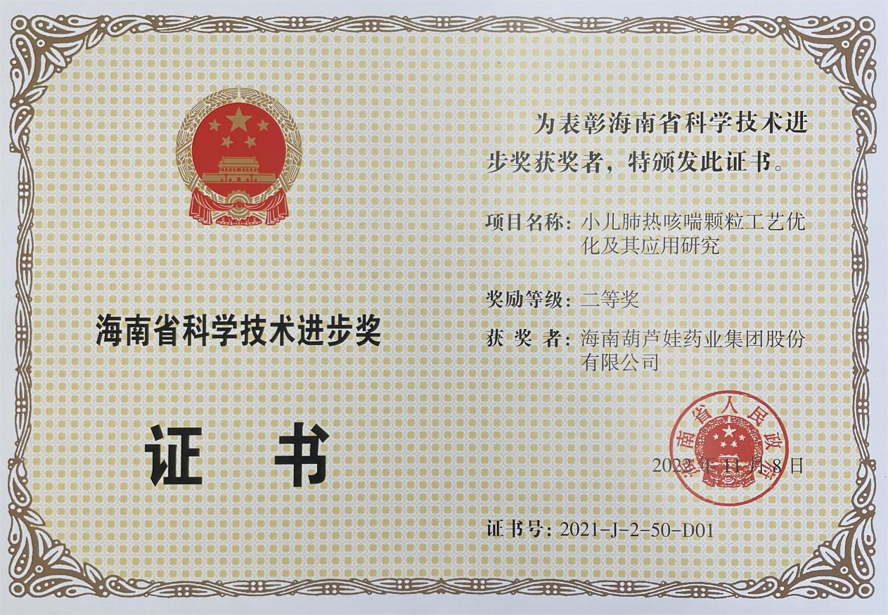 11月15日,海南省科学技术奖励大会在海口召开,揭晓了2021年度海南省科学技术奖。海南尊龙官方网站药业集团股份有限公司凭借“小儿肺热咳喘颗粒工艺优化及其应用研究”,荣获海南省科学技术进步奖二等奖。项目主要完成人有刘景萍、刘全国、胡俊斌、李培湖、刘萍、王家、陈克领、何彦博。